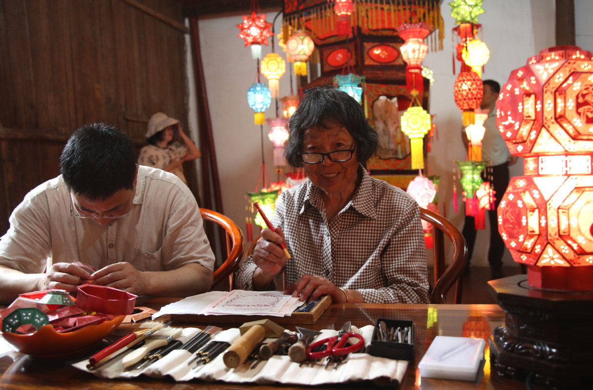 国家级非物质文化遗产项目灯彩(仙居花灯)国家级代表性传承人87岁的王汝兰老人在制作花灯摄影:应小鹰