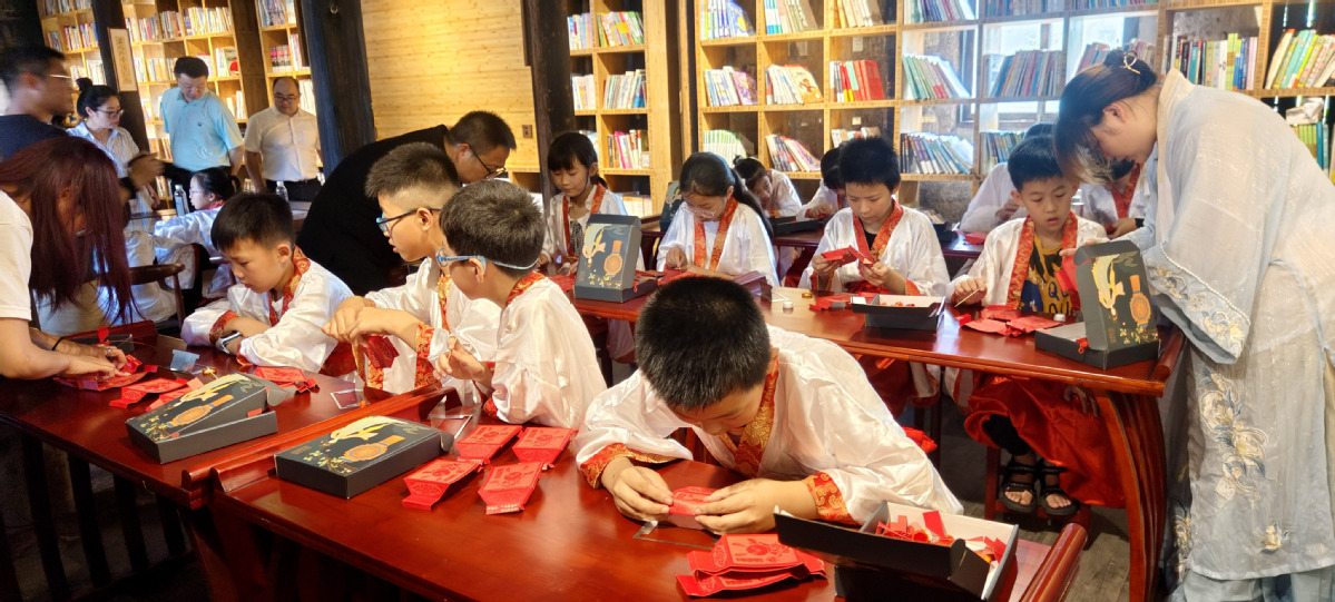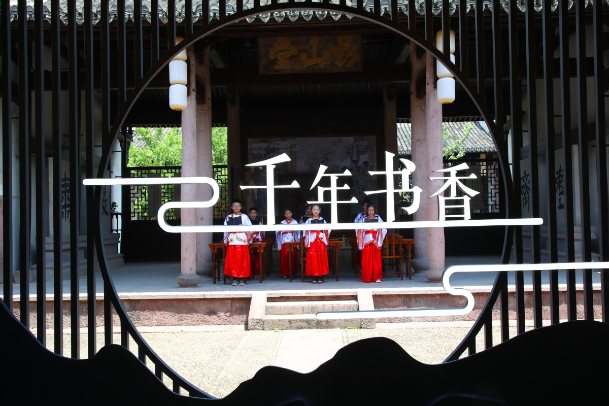 桐江书院中,参加研学的学生们诵读声声声入耳摄影:应小鹰