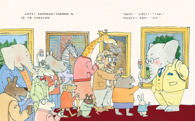 大象巴勃罗的作品成了画展上最耀眼的一幅,所有人都在祝贺他。而在绘本的最后一页,读者终于能看到大象巴勃罗的画——狼画了自己在画所有小动物的画面,而大象画了狼在画所有小动物的画面。