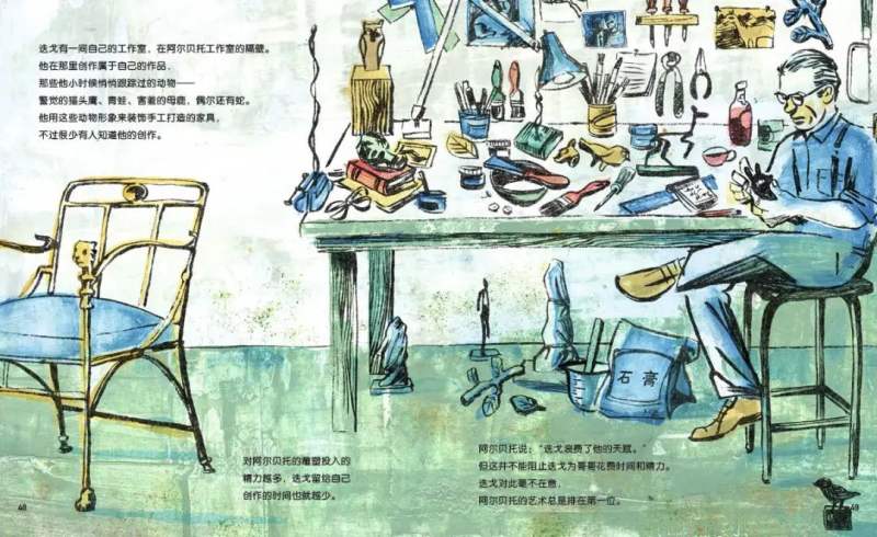 这是一本关于瑞士存在主义雕塑大师阿尔贝托·贾科梅蒂的传记绘本。与其他只讲述传主一生的传记绘本不同,这本绘本从阿尔贝托·贾科梅蒂与他的弟弟迭戈·贾科梅蒂相互扶持的关系入手,讲述了雕塑大师的一生。阿尔贝托在创作出他举世闻名的高大、细长、骨瘦如柴又孤独的雕塑之前,经历了艺术上漫长的探索,以及战争的侵扰,而他的弟弟迭戈总会在他身边协助、支持他。1947年,阿尔贝托开始创作骨瘦如柴、高大的雕像,仿佛是战争废墟中的幸存者。