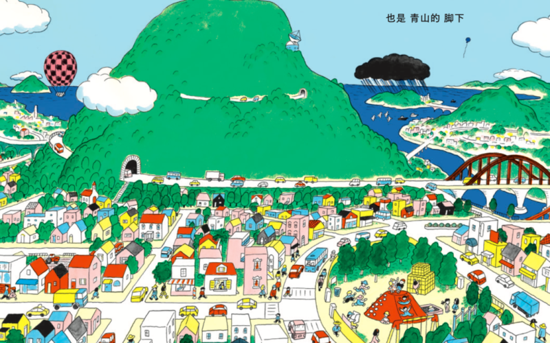 及川贤治的画为诗歌增加了多重故事线。在跟随诗句不断切换视角的画面中,及川贤治画出了小男孩所处的小镇正在发生的故事。一群孩子拿着蓝色的气球路过小男孩的窗前,那个蓝色的气球在公园里飞走了,越飞越高。电视里播放着火箭发射,接着翻下去,火箭就和气球出现在同一个星球的表面。青山的脚下小镇里人们仍享受着晴天,远远的一片乌云出现。而当大雨瓢泼后,那群拿着气球出门玩耍的孩子也拿着湿漉漉的雨伞回家去。图与文的结合、呼应、延展给这本绘本增加了许多乐趣。而随着诗句不断变得更高、更诗意的视角也让读者的阅读充满了乐趣。
