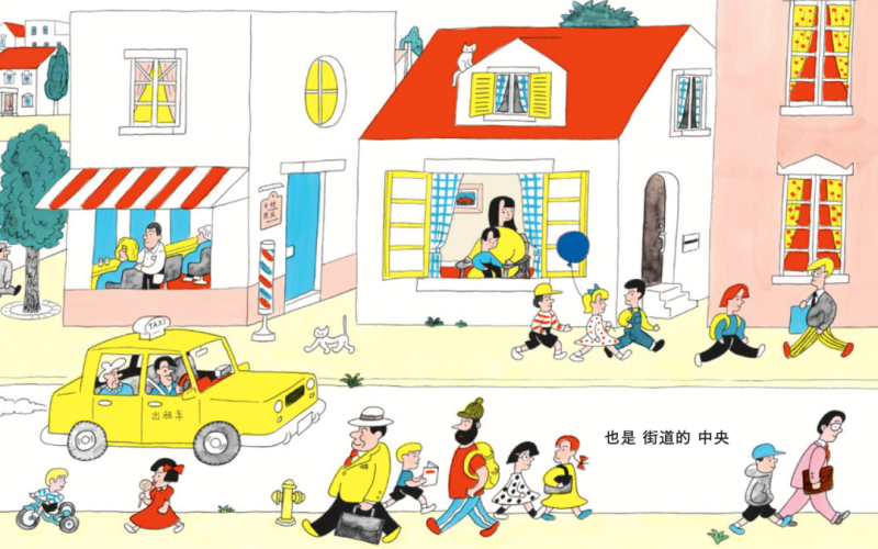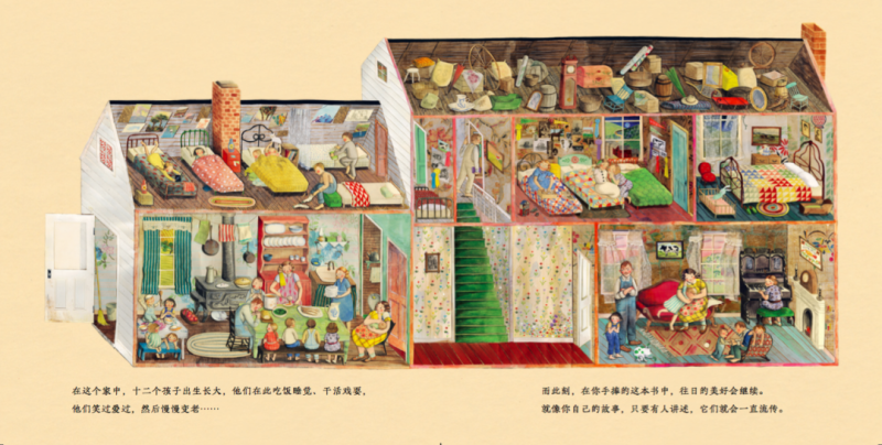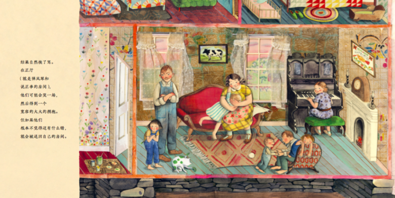 在这本绘本中,苏菲依旧采用了她喜爱的构图方式,用建筑物剖面来展现全部空间与其中的生活痕迹,让读者在翻页中不断将某个房间的分镜与整体剖面图对照。阅读这本绘本的时间可以很长,去看每个孩子在做的事,看每个角落的细节,从这个房间走去那个房间。读完后,读者会熟悉这个房子的一切,就像熟悉自己的家一样。