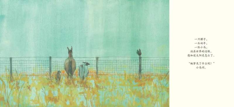 这本绘本乍一看平静细腻,但细细阅读,能感受到不论孩子还是大人都会有的天真的执着。三只动物出于对世界的担心,鼓起勇气去冒险,去”世界的边缘“唤醒太阳”,而实际上,所谓世界的边缘也不过是农场的尽头。困囿于小世界的生命,却关心太阳是否会照常升起,这是一种纯真,也是一种勇气。而在去冒险的途中,三只动物不断去想象他者在做什么梦。这种对世界的无知与自发的担当,对他者的好奇与诗意的提问,不正是儿童本身吗?