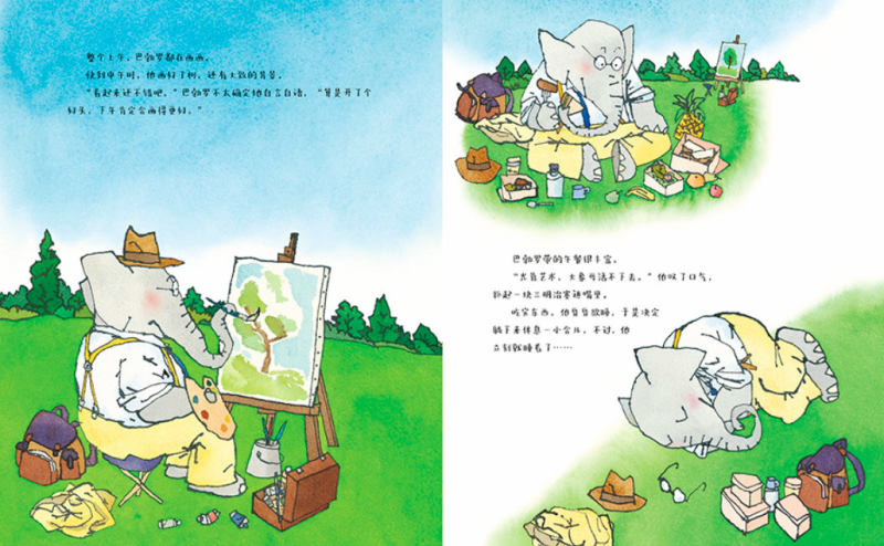 这是日本幽默绘本作者喜多村惠的作品,他从一个大象想画一幅能参加展览的画开始,讲述了一个直到结尾才揭开悬念的故事。大象巴勃罗的创作遇到了瓶颈期,他来到大自然寻找灵感。他画了蓝天、草地和大树,然后睡了一觉。在梦中,绵羊拿起画笔,把草地画得“更可口”,松鼠给大树画上了果实,小鸟把天空画成更明亮的蓝色……而大灰狼把画画得十分完美,获得了大家的夸赞。大象睡醒了,他有了灵感。到这里,喜多村惠设置了双重悬念:梦中的狼画了什么?大象巴勃罗又画了什么?