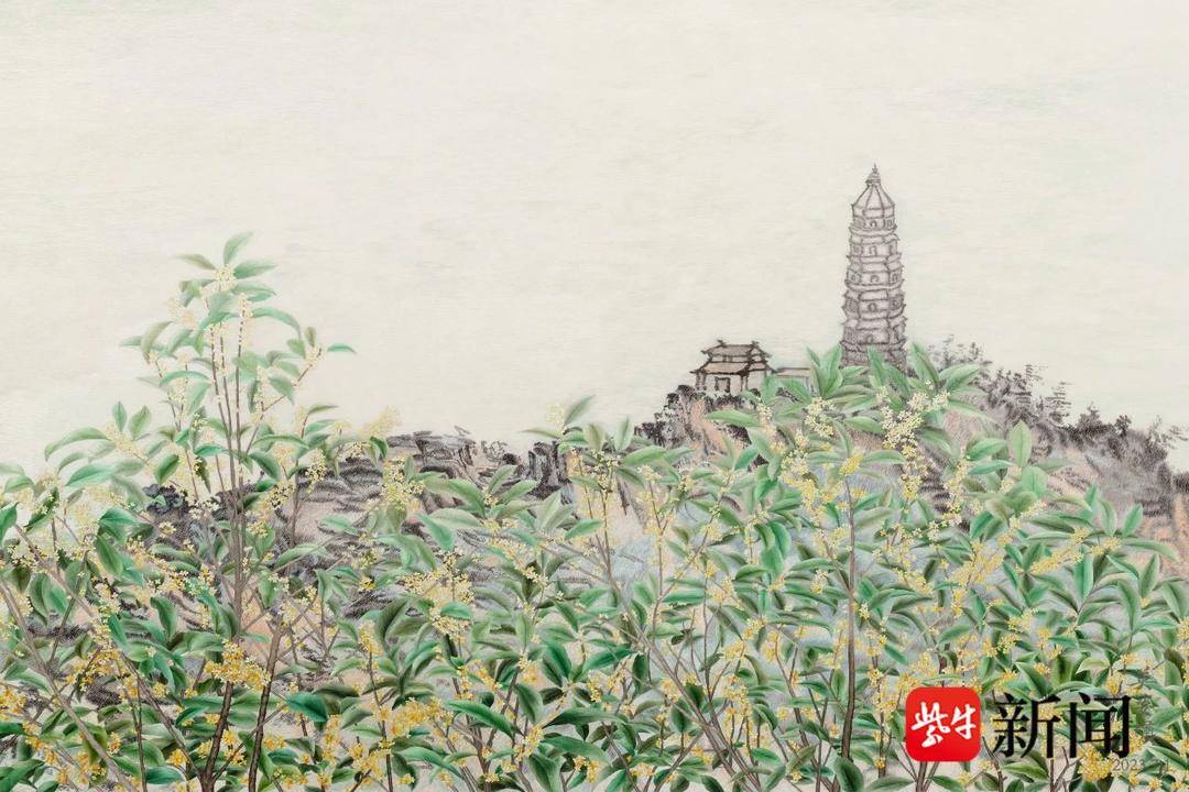 长三角的山水,乡村山里(民居)姑苏古城(虎丘塔)及现代城市(高楼大厦)的结合绣面用中国青绿水墨勾画:丹桂、金桂、银桂盛开在虎丘塔前,江湖波光涟漪、渔帆点点,山丘原野桂花飘香,村舍掩映、稻黄片片;近山秀丽、远山连绵,江湖浩渺、优美恬澹。