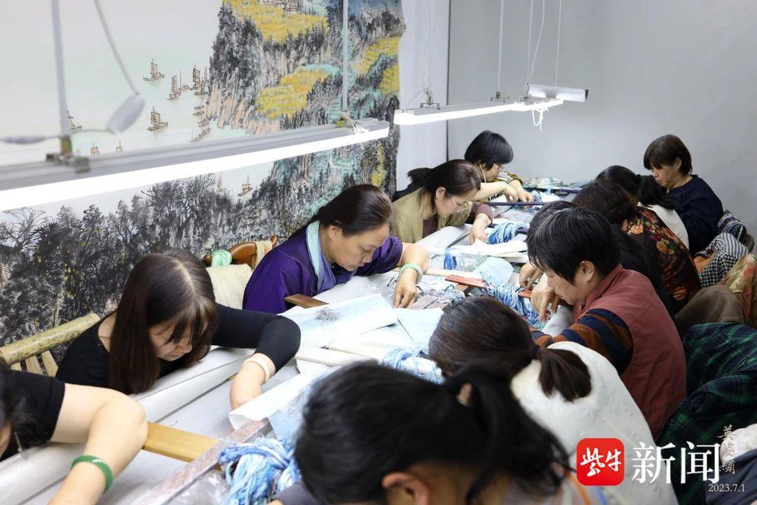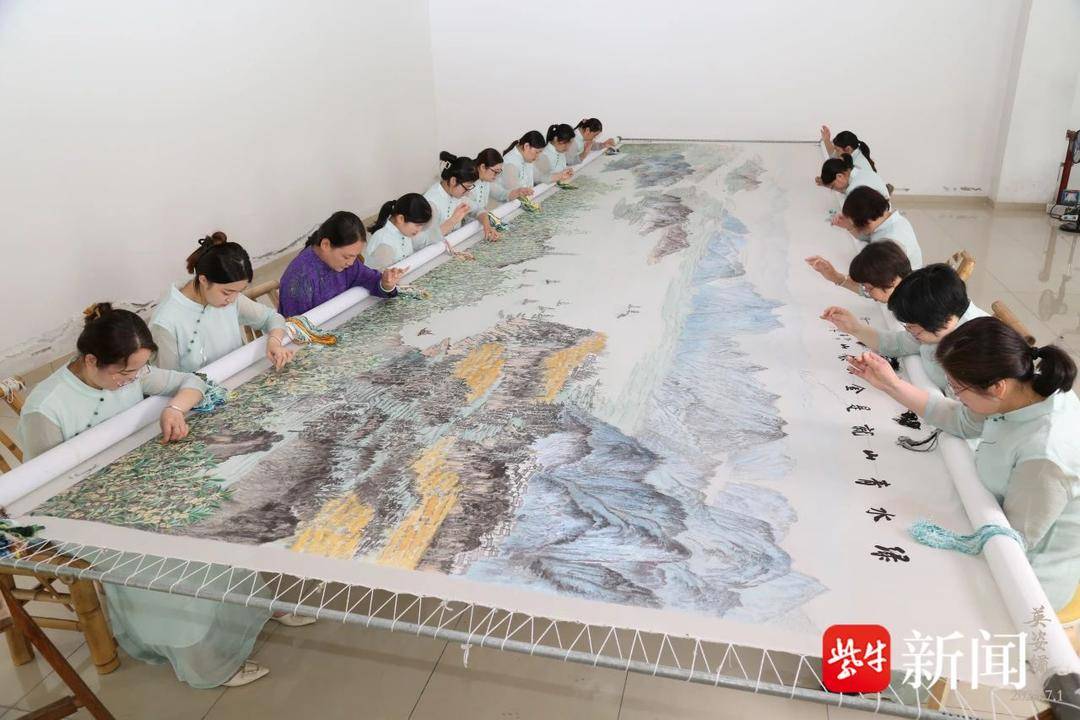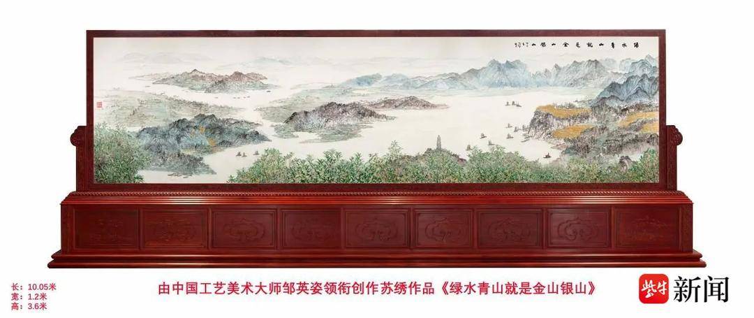 近日,迄今最大整幅的苏绣作品《绿水青山就是金山银山》在邹英姿刺绣艺术馆封针,装裱红木框架后的苏绣插屏被安装落成在苏州国际会议中心报告厅前厅。这件绣面宽9米,纵2.3米的刺绣作品,原画由中国工艺美术大师邹英姿创意并由工笔画家华彬、山水画家高荐绘成,邹英姿大师带领工作室近百位绣娘历经两年时间绣制完成。