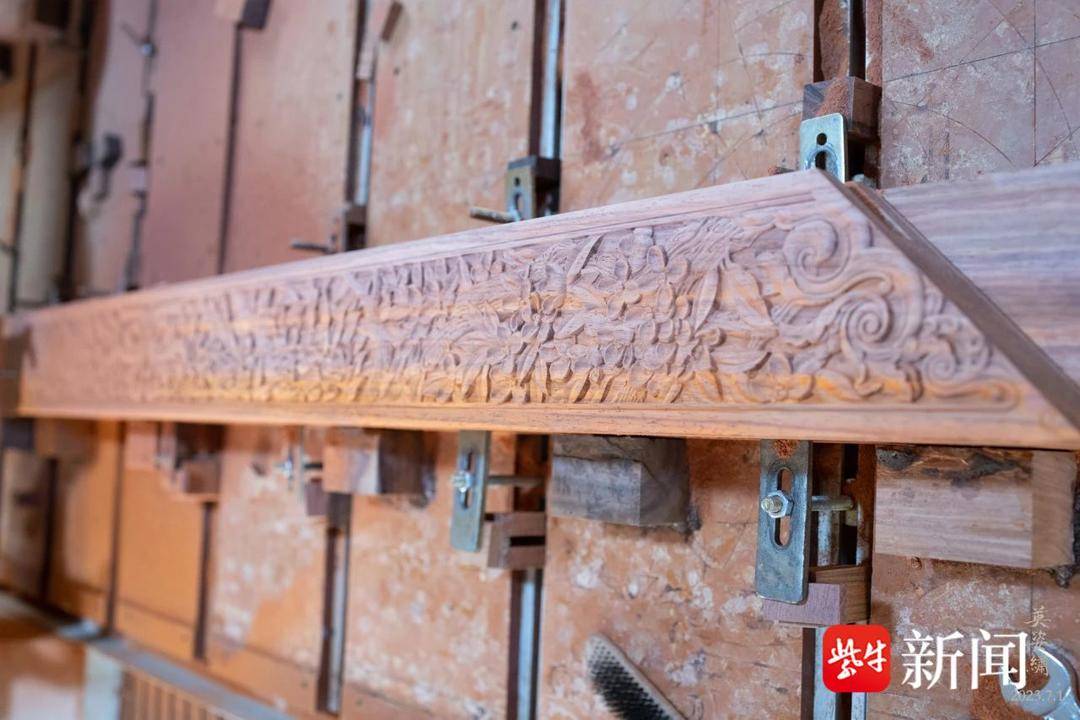 苏绣背后,还有明式家具制作技艺这项非遗加持。装框后的刺绣插屏整体长10.2米、高3.6米、厚1.2米。红花梨框架装裱,由国家级非物质文化遗产代表性传承人许建平设计雕刻花样。江苏省工艺美术名人、苏州明仕阁创始人史忠明先生和史志晔团队用时150多个日夜制成。框架上方边框上浅雕桂花纹样,中间莲花花瓣点缀,下方九只如意,两侧雕有园林小景。绣桂花,雕桂花,量身定制的红木框使作品整体更加协调精美、大气端庄。