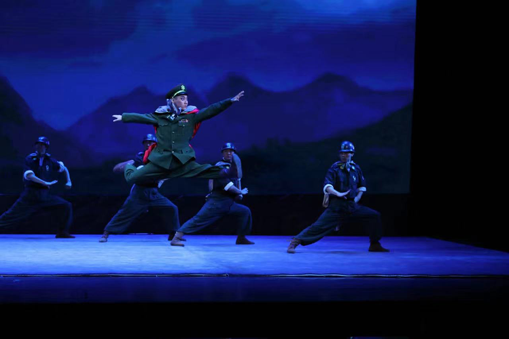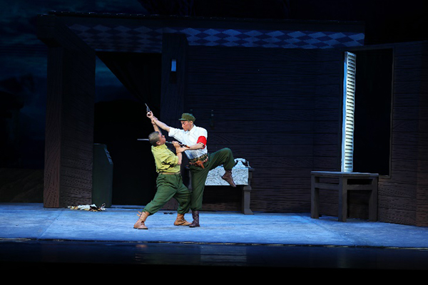 剧中让人印象深刻的段落颇多,一些群戏更是以潇洒利落的武戏身段和创新程式极具观赏性。尤其第六场“插入敌后”中,主演和“尖刀班”演员以多种姿势从两米的高处“下高”,“云里前扑”、“云里翻”、“下高三百六转体”都是极具技巧性和非常考验功力的动作,精彩场面让观众不断叫好。此外,还有翻铁丝网、跳窗追敌等动作,难度系数也十分之高。