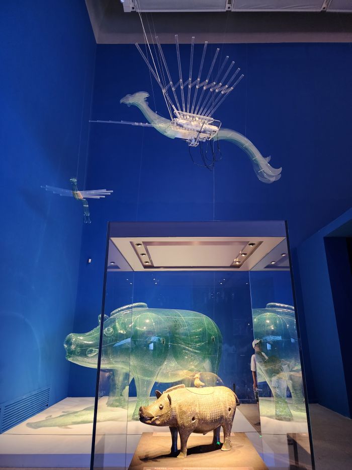 张沐辰的参展作品《数字猪尊》与湘博的国宝级藏品“商代豕形猪尊”展开多媒体互动对话。艺术家把“猪尊”转换成一个巨大透明的充气模型,祭祀和神话的功能被解构,反而变成了一个可视化的三维模型。空中透明的飞鸟与视频结合,构成了一个真与假的荒诞剧场,一个处于历史和高科技之间的景观。