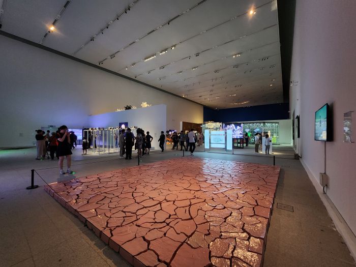 解丁泉的参展作品名为《皮肤》,这件作品关于中国最大的淡水湖——鄱阳湖。去年鄱阳湖大旱,湖水面积缩减创下了历史之最。艺术家在鄱阳湖拍摄取材了干旱面积的一千万分之一的面积,烧成了700余块大小不规则的陶瓷。自然与生态环境的变化成为了世界性的问题,艺术家以此来唤醒我们对极端自然环境的关注。