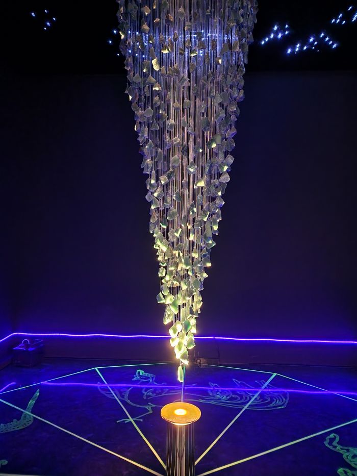 张燕妮的作品《死事如生羽化升仙》选用了西汉南越王墓中的玉璧造型作为作品的中心,用青玉原石材料悬挂,利用激光灯柱向上构成的锥形光束将带有灵气的玉石送向天体。作品提炼了抽象的视觉图像和象征性的物质材料来表达汉人羽化成仙的思想。