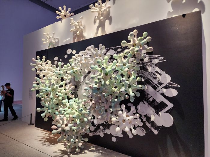 法国当代艺术家托尼·布朗参展的作品是NEBULA/TwobirdsinaTree,在作品中,微观与宏观、细胞与病毒、身体与自然世界神奇地融合在一起,是如此的魔幻而真实。微观的自然世界细胞可以对应宇宙银河,细胞就是世界的最基本单位,艺术家似乎天然就有一种去发现世界秘密的直觉。