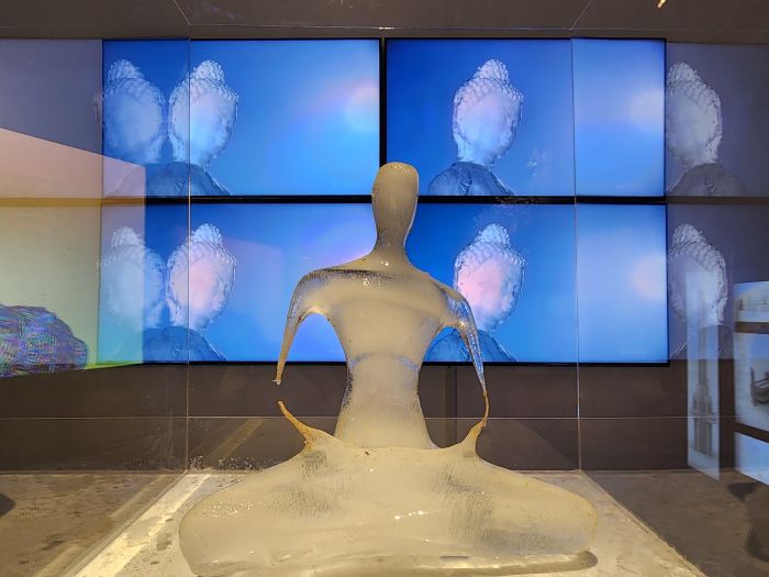 嘎德是来自西藏的艺术家,他的参展作品是《冰佛》。他取拉萨河的水,将其冻成冰,并雕凿成一尊释迦牟尼佛像。并让这尊冰佛自然融化,重新还原成水。背景则是佛像的数字化照片,从佛教的观念来讲一切都是梦幻泡影,一切都是虚妄,艺术家在佛法的智慧里去阐释生命、时间、空间的生长与消失。