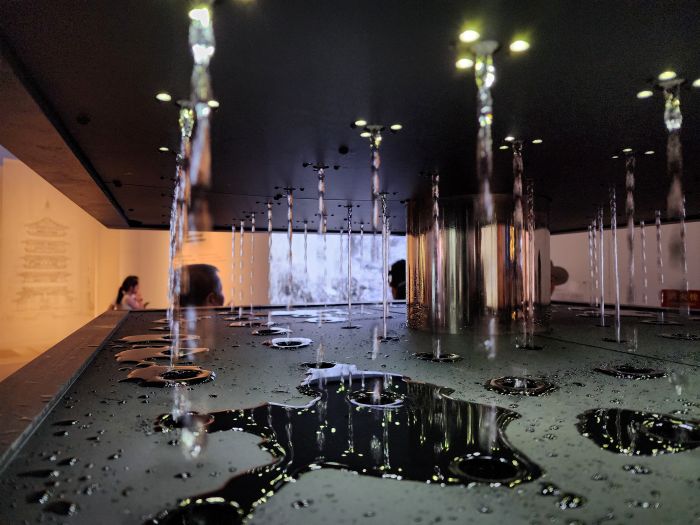 新锐互动媒体艺术家吕连涛的参展作品是《倒流-时间的缝》,两块简洁的方形石材被中间的水珠隔开,水珠为悬浮上升状态。两块方形石材类似“方鼎”——代表天与地,而“虚”的水珠倒流象征着时间。他的作品有一种哲学化的悖论思考,从观念语言的角度去展开隐秘的讨论。