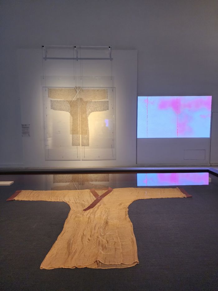 梁绍基是一位隐居在浙江天台山,养了三十几年的蚕,用蚕与丝创作的当代艺术家。此次他用《平行隧道》与《8字谜》两件作品来对话汉代的《素纱单衣》。素纱单衣的材质成为梁绍基对话的桥梁,《8字谜》是揭示了蚕吐丝的轨迹路线,《平行隧道》则用蚕丝构建了一个通往历史与未来的空间。梁绍基在全球化数字时代用生命经验和艺术创作去重新讨论汉代先民们的智慧与生命哲学,日复一日的生活就是生命的真谛。