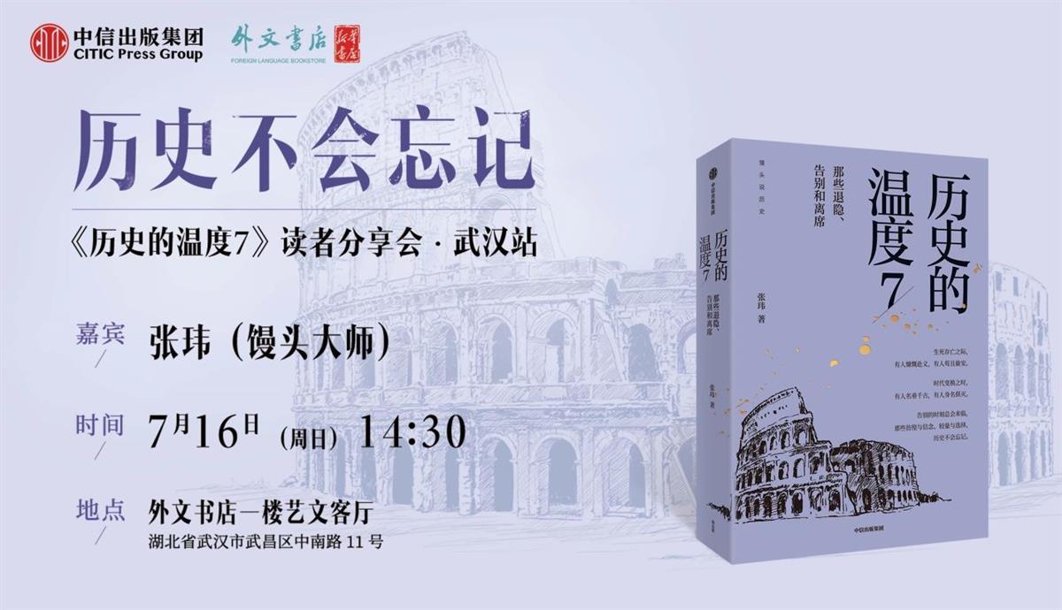 从体育记者转型成为畅销书作者,用通俗易懂的方式为大众讲述历史的温度,对于他——“馒头大师”张玮,你是否有关于人生选择或者历史的疑惑想请教、追问?极目新闻记者获悉,7月16日下午,张玮将来汉做客湖北省外文书店“阅界大讲坛”,带来历史不会忘记 ——《历史的温度7》读者分享会。