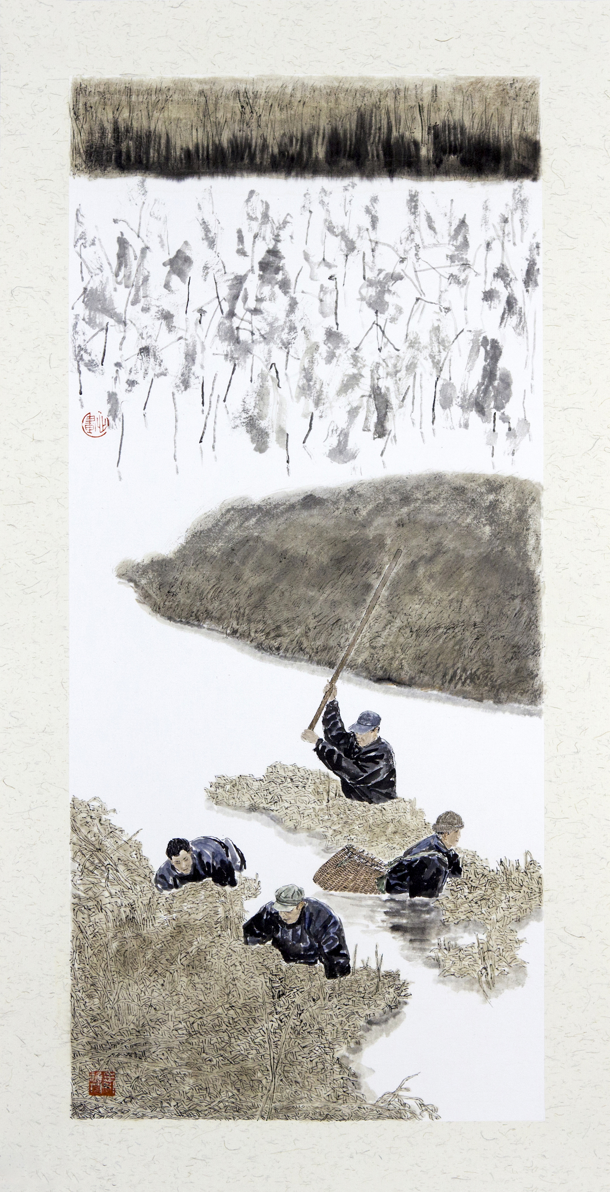 远远地来了一帮闹滩的队伍,他们是驾着小船来的,三条船,每条船上都有五六个人。这些人身着皮裟,只露出头和手,腰间别着鱼篓,猛一看活像一群水鬼。来到一处水域,“水鬼”们手持竹竿,依次下水,似想整成一个队形,可谁都想占个有利位置,不免推推搡搡,也就一会儿工夫,很快各就其位,十几个人编成一个扇形,朝向芦滩。排在边上的“水鬼”面露愠色,嘴里嘀咕着,显然不服气,但也没办法,或许资历浅,或许水平差,或许力气小,那就不知道了。