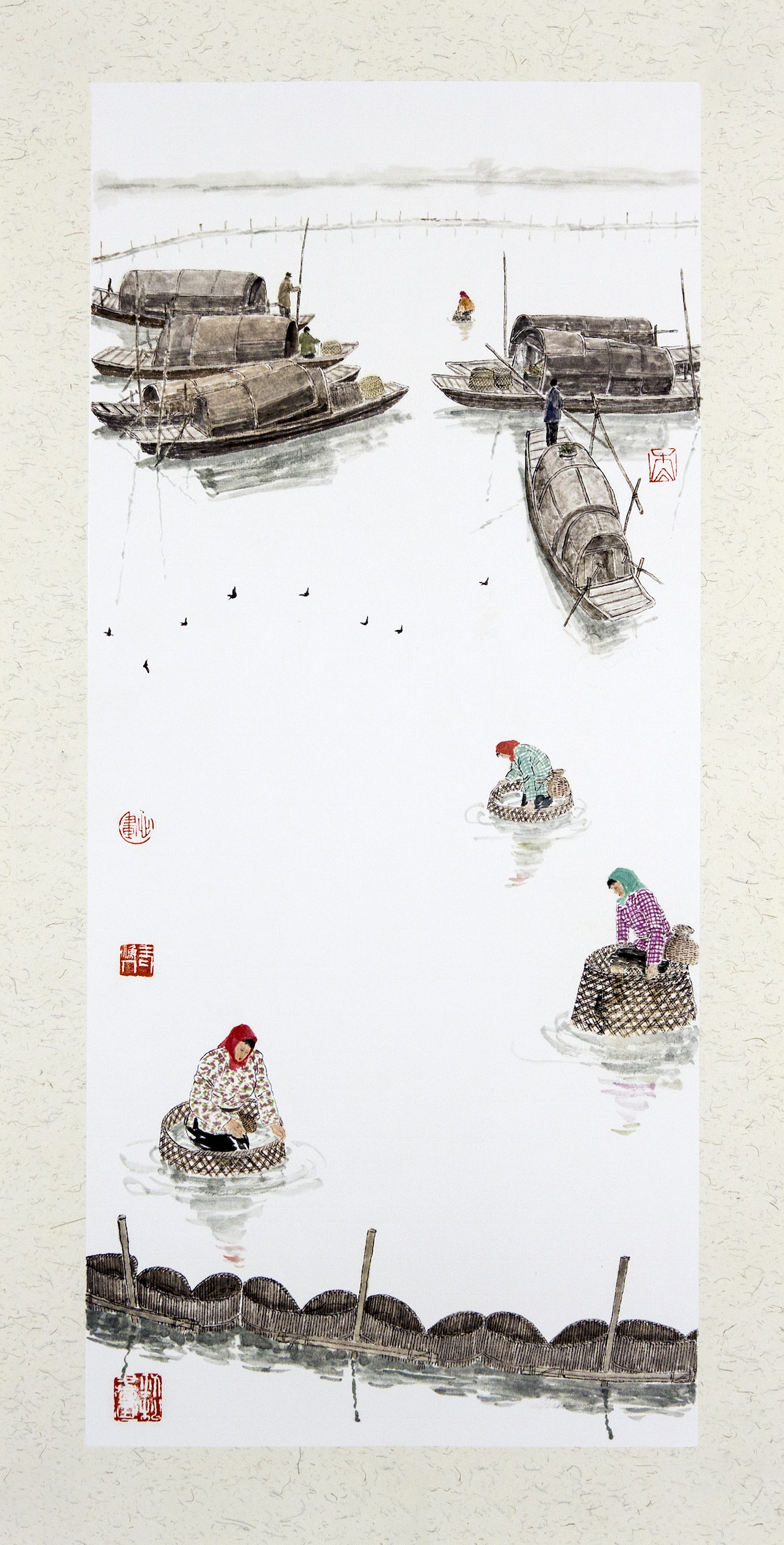 忽然,我发现这条渔船的后面还有两条渔船,始终保持一定的距离,虽说离得很开,却一直是平行的。两条渔船上荡桨的都是女人,她们用力划船,船并不怎么快,倒像被什么东西牵扯着。三条渔船之间似乎毫不相干,可渐渐看出它们有着某种默契,肯定是“一伙”的,你看,荡桨的女人还不时回头瞅瞅身后的那条渔船呢。猜测归猜测,还没有得到验证,我只好跟着这三条渔船一路看下去。直到天色将晚,渔人收工了,我才瞧出其中的奥秘。