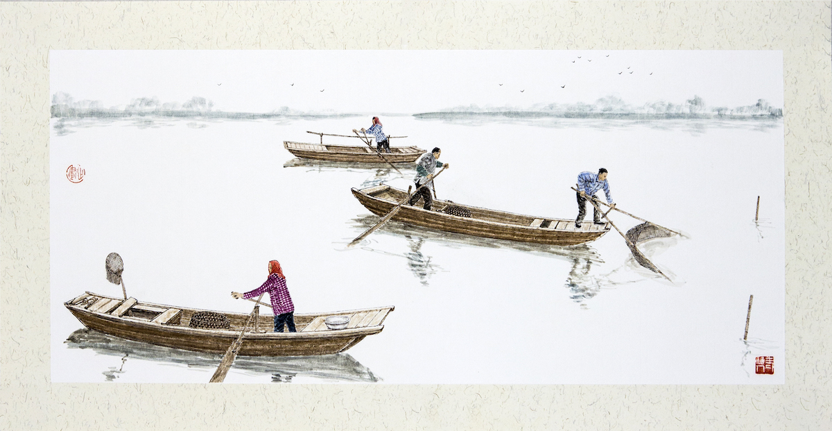 这条河流到底漂泊过多少渔船,发生过多少渔事,谁能说得清呢?我家就住在车路河南岸,记得小时候常常喜欢坐在庄后的圩堤上,看来来往往的渔船,看渔人捕鱼,就像看一台大戏。这样的演出不知看了多少遍,都是同样的情节,还有熟识的演员,但却没有厌倦的时候。看拉网,看撒网,看张网,看放老鸦,看打篦篈……看得不亦乐乎,看得自己都成“渔事通”了。然而有一天,碰上了一件奇怪的渔事,竟是我从未见过的。