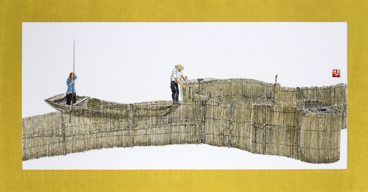 《故乡渔事》中文与画,都在释“渔”,篦篈、罾、闸箔、鱼槽、钓筒……正如一些评论所言,渔人与鱼画是两种风格,鱼画表现的鱼,而渔人表现的是捕鱼的人,是对传统捕捞技艺的记录。这些“渔文”与“渔画”着眼于里下河的风土人情,以“渔事”作为表现的对象,诸如与捕鱼相关的五花八门的工具以及各种奇门异巧,绝不仅仅是乡愁,而是有种内在的辽阔和宽厚,是嫁接在深厚的文化传统之上的灵与美,也是对中国水乡非物质遗产的打捞与呈现。