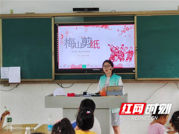 文旅志愿者易满媛在为学生讲解梅山剪纸。陈洁摄