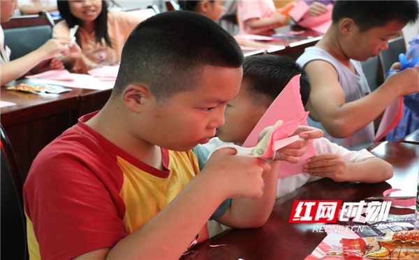 梅城镇长安村小朋友们在体验梅山剪纸。陈洁摄