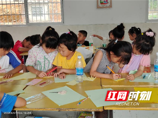 仙溪镇大溪村小朋友体验梅山剪纸。何应湘摄