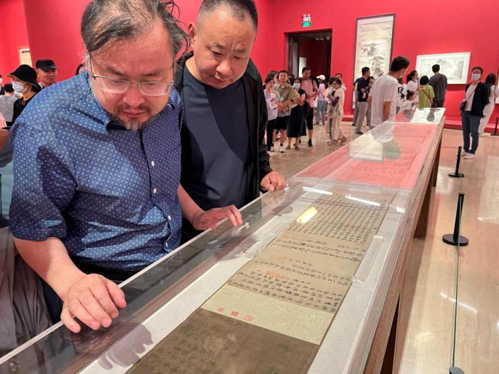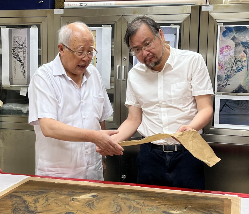 张晴(左)与非遗传承人佘贤兵研究与分析苏东坡《潇湘竹石图》的纸质。