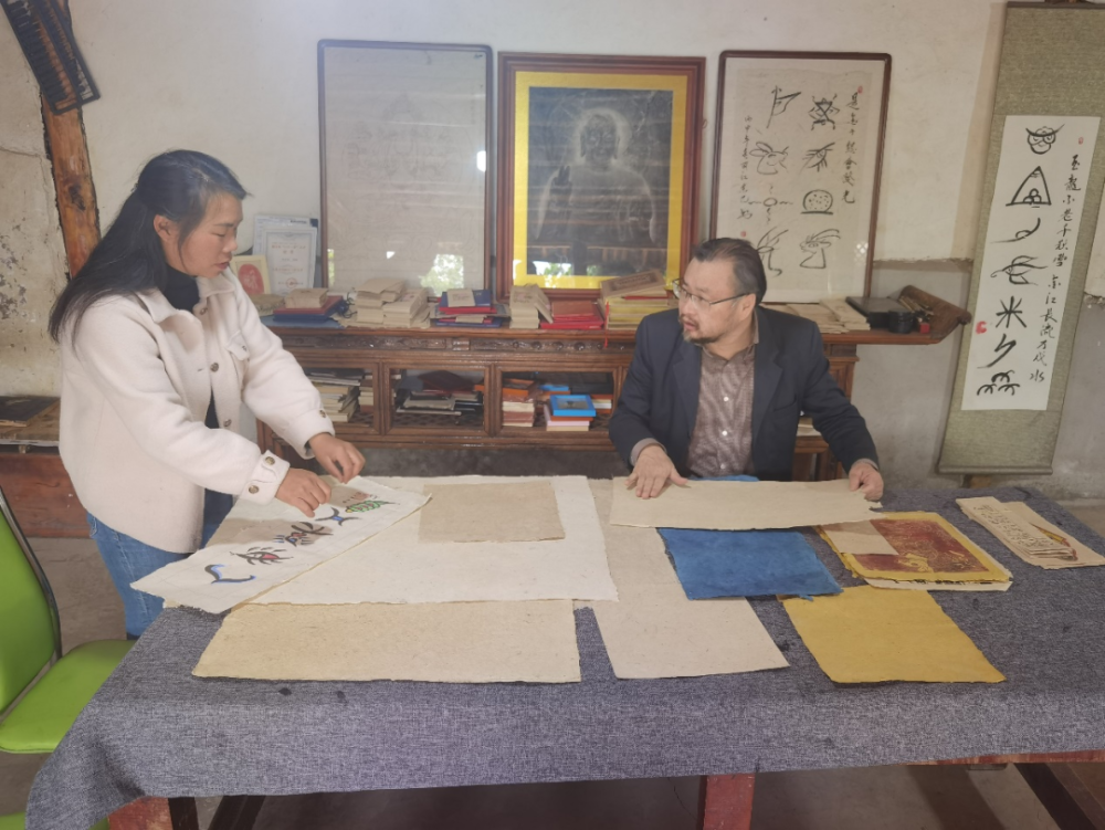张晴向丽江东巴造纸非遗传承人求教古法造纸工艺。