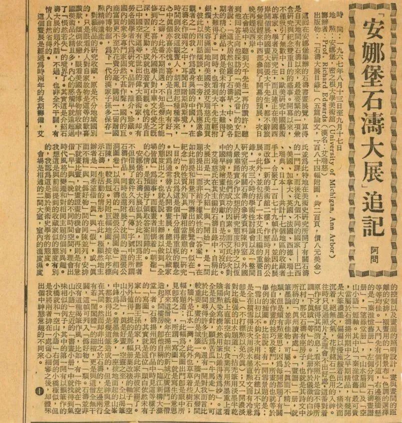 展览中有一件展品是吴同(曾任美国波士顿美术馆东方部主任)在观看1967年安娜堡石涛大展后,以笔名阿问发表在台湾《中央日报》上的《安娜堡石涛大展追记》,当时一共连载了七期,这次展出了所有的原始剪报。1967年八月十三日石涛大展开幕,由美国安娜堡密歇根大学承办,艾瑞慈策划,展况盛大。与此同时,吴同(曾任美国波士顿美术馆东方部主任)以笔名“阿问”发表在台湾地区的《中央日报》上,并连载七期。同年,波士顿大学举办了第二十七届国际东方学家大会,张大千被邀请参会,并于参会期间参观了密歇根大学举办的石涛大展。