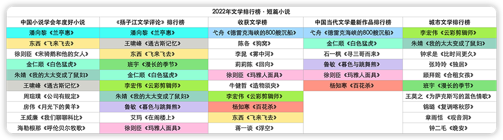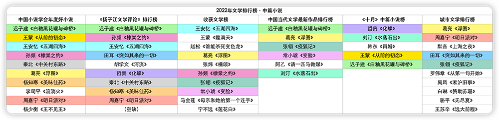 相比往年,2022年的小说榜来得慢了一点。澎湃新闻记者依然制作表格,把几大榜单结合到一起进行比较分析,希望能从某些视角一探2022年中国文学的面貌。
