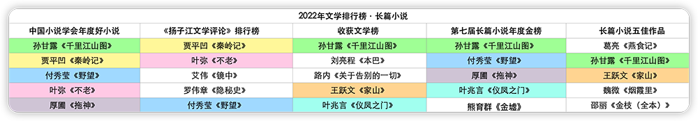 总体看来,比起前两年,2022年的长篇上榜重合率明显低了,不同榜单的位列排序也存在不小的差异,几次出现了“榜首作品在其他榜单里并未出现”的情况。在五大榜单里,除了《千里江山图》,另外两部榜首作品分别是贾平凹的《秦岭记》和葛亮的《燕食记》。