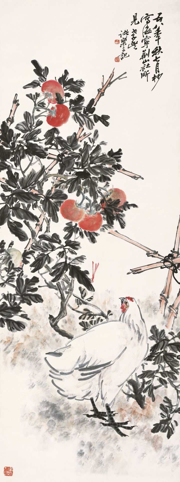 1958年作《白鸡红柿》(中国美术学院藏)135.5×50.5cm