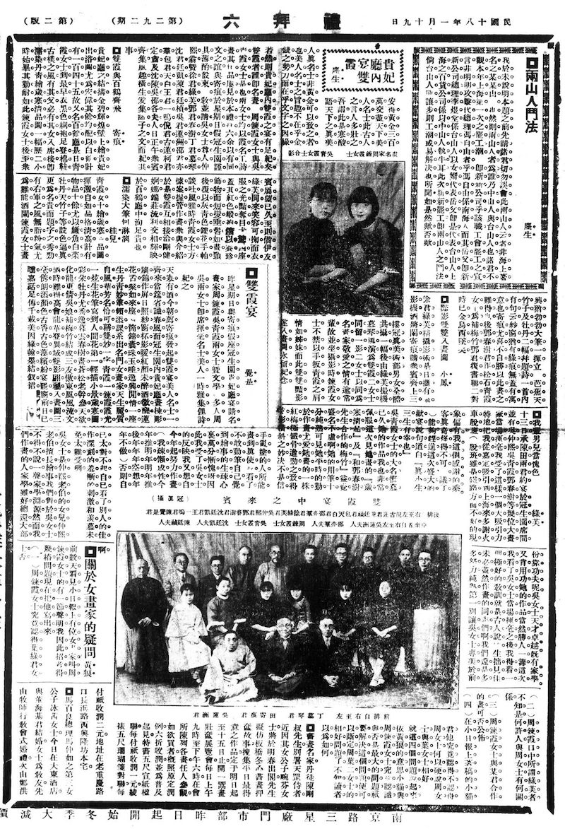 这两张照片,甚至是一组照片,应该拍摄于1929年1月13日。这一天是星期天,由田寄痕等在上海冠生园的贵妃厅宴请女画家周錬霞和吴青霞,以及文艺界多人。这次宴会的主角是两位年轻且才貌双全的女画家。所以宴席设在了“贵妃厅”。席间两位画家挥毫作画,并且在大家的见证下,正式结识对方。“众与介绍,于是双霞互相接洽,刚健、婀娜、端庄,流利,交相辉映。”(田寄痕《双霞与百鹤齐飞》,《礼拜六》1929年1月19日)关于这次宴席,《礼拜六》用了一整个版面报道。几位参加者从不同的视角描述了这次活动。宴席快结束的时候,周吴两人合影留念。在署名小凤的《艳影双双入画图》一文写道:“徐君绿芙精摄影术。是日携有摄影机。酒将阑,寄痕请众宾齐上三楼,冠真美术部男女全体共摄一幅后,由绿芙撮机,慕琴导演,为双霞二女士同留一影。二女士以同为名画家,敬爱之情有逾常辈,故并坐摄影时,錬霞女士,不禁以手扳青霞之肩,情如姊妹,而此双双艳影,遂入画图,永留纪念。” (《礼拜六》1929年1月19日)文中提到的“以手扳青霞之肩”这张就在丁悚的相册里。周錬霞与吴青霞的拍摄由丁悚导演。丁悚具有丰富的拍摄经验,尤其善于捕捉女性之美。在他的相册中,有许多拍摄女性友人和家人的照片,每一位的不同性情与气质都被他准确地捕捉到。此时的徐绿芙(徐晚苹,号绿芙外史)还没有与周錬霞结婚,在丁悚前辈的面前,他唯有按照丁悚的导演按下快门。刊登在1932年第2期《中华摄影杂志》的《我的摄影琐述》一文,丁悚说编辑请他谈谈关于人像摄影的经验。于是他说“现在就把我对于女子方面的摄影经验来谈谈吧。”看来他真的颇有心得。“女子摄影最忌是呆板……所以和女子摄影,最好对方和摄影的人一定要很熟的,得到的成绩,比较来得有自然的趣味。女子的笑,一种最美的表现。”丁悚丰富的摄影经验也令这组周吴合影得到了好的成绩。照片中两位少女,巧笑倩兮,美目盼兮,自然生动。不过,十几年后,因为丁悚的一篇文章仍然是关于会摄影的男士对于女性的吸引力,提到当时与徐晚苹同时追求周錬霞的还有一位摄影爱好者,没想到竟然引起了周錬霞徐晚苹夫妇之间的矛盾,徐晚苹说丁悚错记了,丁悚不服气又写了一篇《竟想不到的憾事》予以回敬。(p266丁悚著、丁夏编《四十年艺坛回忆录》上海书店出版社2022年)仅仅数年后,这些文中提到的人就走向各自不同的去处。徐晚苹去了台湾,周錬霞于1956年进入上海中国画院任画师,丁悚也于同年进入上海文史馆。