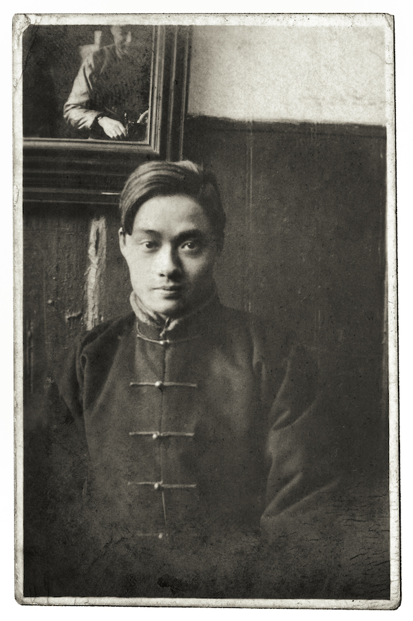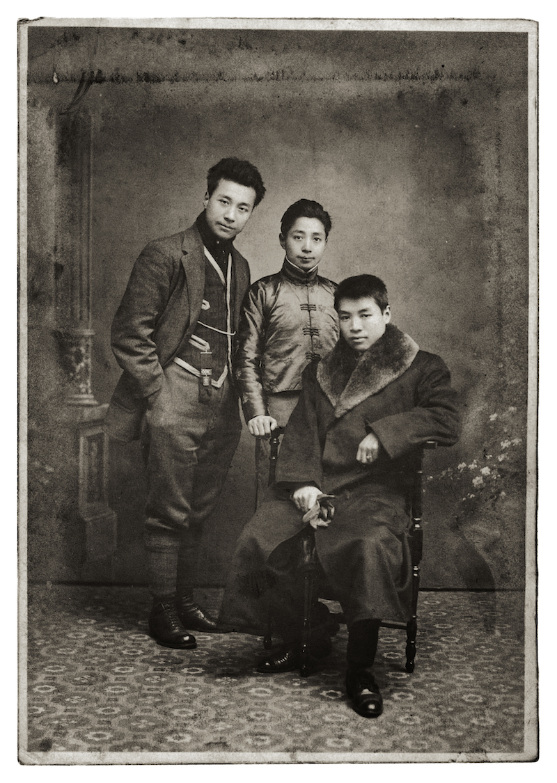 尽管照片已经斑驳,但三人身后的背景墙上还留有淡淡的西洋柱式的轮廓。这样的照相馆背景画对于这三位而言,应该都很熟悉了,张聿光更是个中高手,精于舞台背景画的绘制。