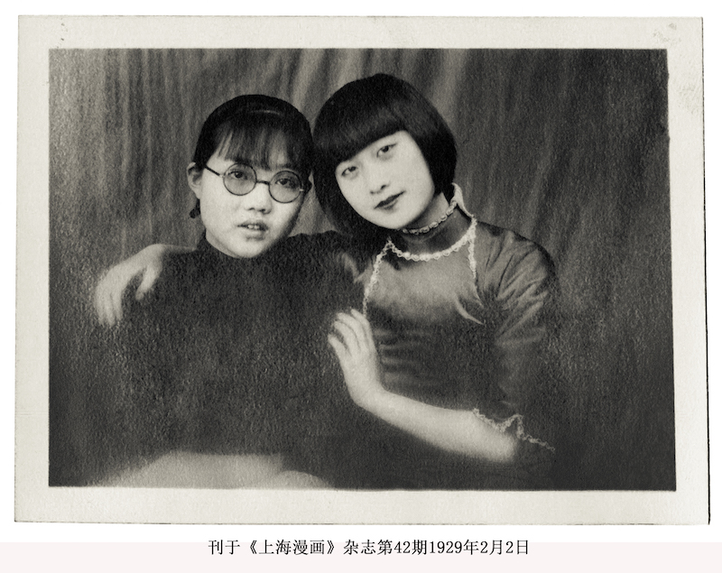 丁悚与徐晚苹应该在摄影的创作和实践方面有所交流与交集,同时徐晚苹也在《礼拜六》担任过编辑。1933年《礼拜六》的元旦专辑摄影版由徐晚苹编辑,其中刊有丁悚拍摄的《书画名家陈小蝶先生》。丁悚在《开麦拉艳屑》一文中做过有趣的分析,即会拍照的男士在婚恋场上运气更好。“假使在从前,能擅摄影技术,自备了具摄影机,只要不肉麻软片,那么到处占着便宜,尤其是时髦的女性,而且女性可以包括一切女伶影星歌女等等,没有一个不对摄影发生好感,甚至因此而结为腻友,进一步竟缔成鸳侣,这例子是很多的,如但杜宇和殷明珠、黄绍芬和陈燕燕、徐晚苹和周錬霞、郎静山和雷小姐” (p266丁悚著、丁夏编《四十年艺坛回忆录》上海书店出版社2022年),丁悚此话不假。在丁悚的相册里有一张年轻时代周錬霞与吴青霞的合影,这张合影与另一张刊载于1929年《礼拜六》第292期的周吴合影十分相似,从发型、妆容、服饰和背景来看,应该是拍摄于同一天,只不过两张照片的人物姿势稍有不同。《礼拜六》的合影,周錬霞吴青霞并排坐着,两人之间有空隙。丁悚相册里的这张则两人更为亲近。周錬霞右手搭于吴青霞肩上,左手扶着吴青霞左臂。两人的头倚在一起。