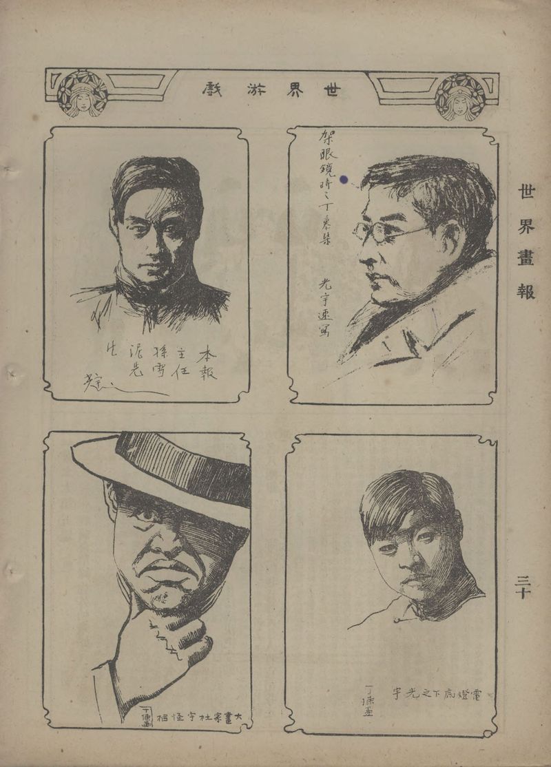 张光宇画的丁悚和孙雪泥,丁悚画的张光宇和但杜宇,刊于《世界画报》第5期第34页,1918年