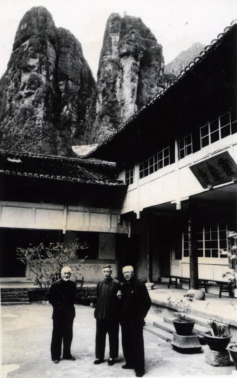 1963年4月,上海中国画院同仁赴雁荡山写生,王个簃、孙雪泥、朱屺瞻在山下灵岩寺合影.