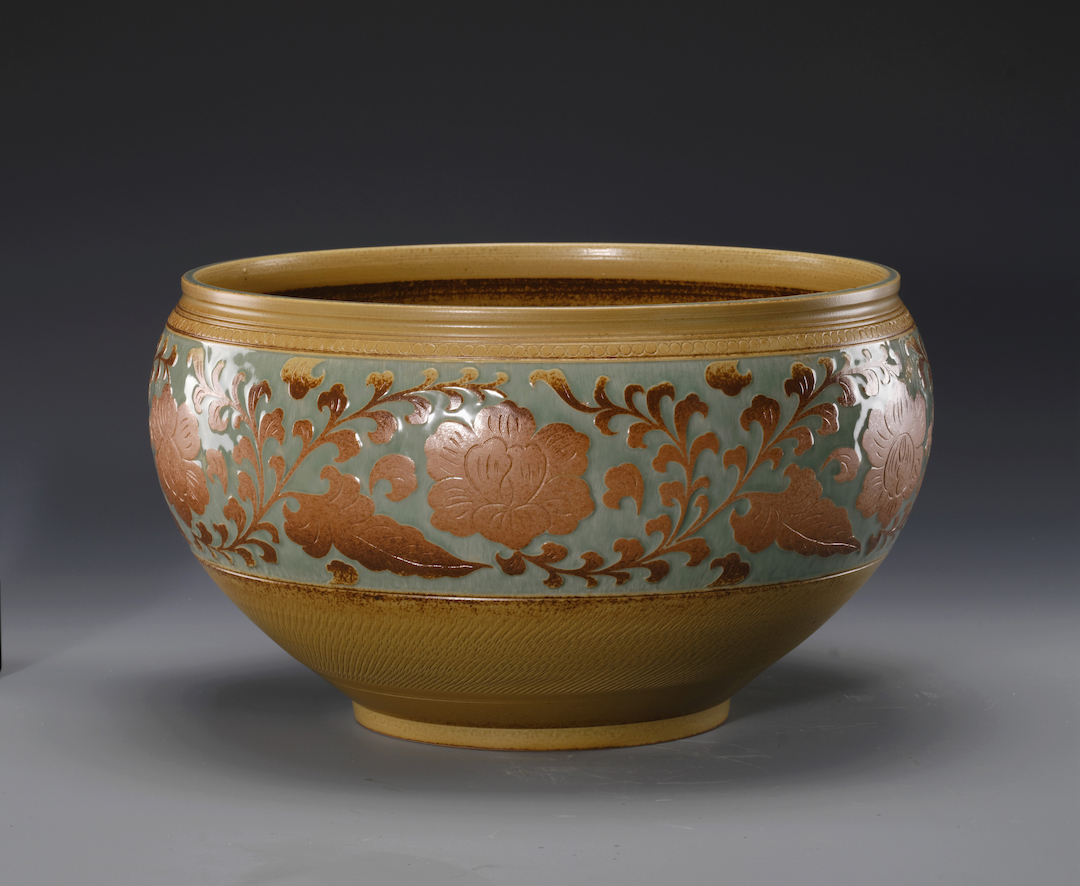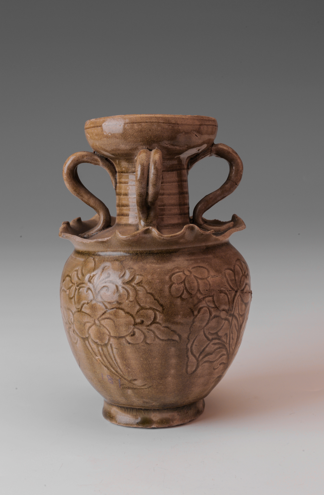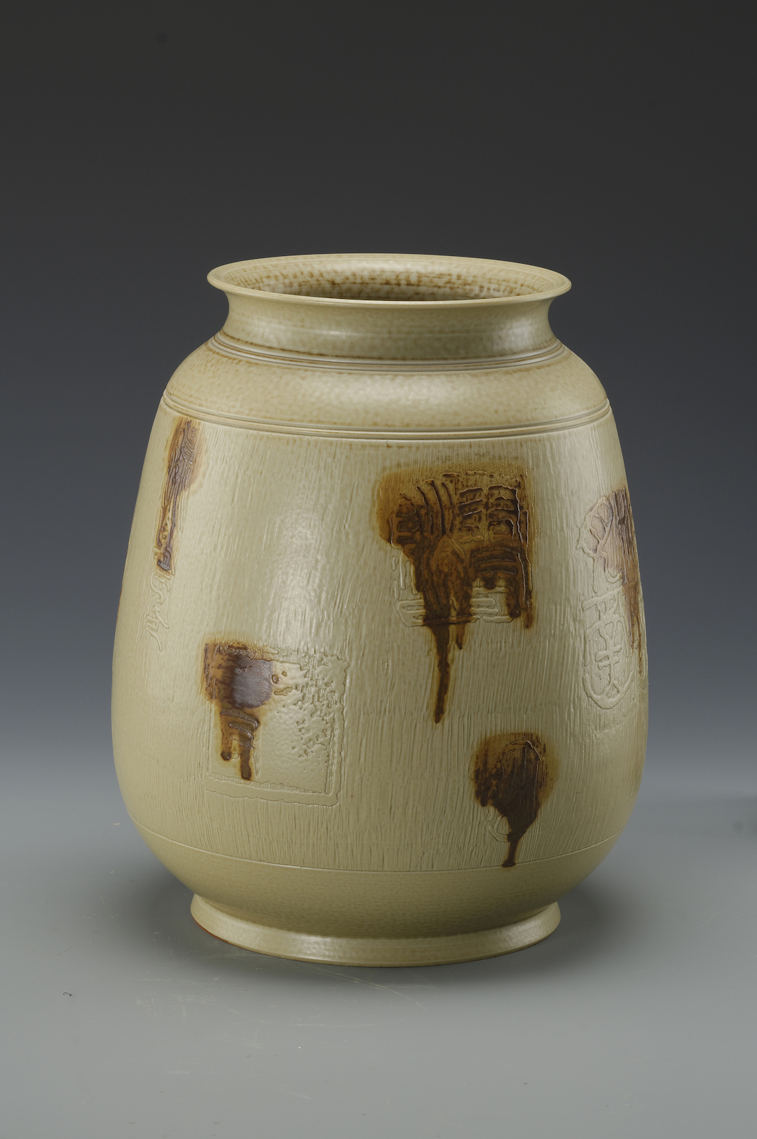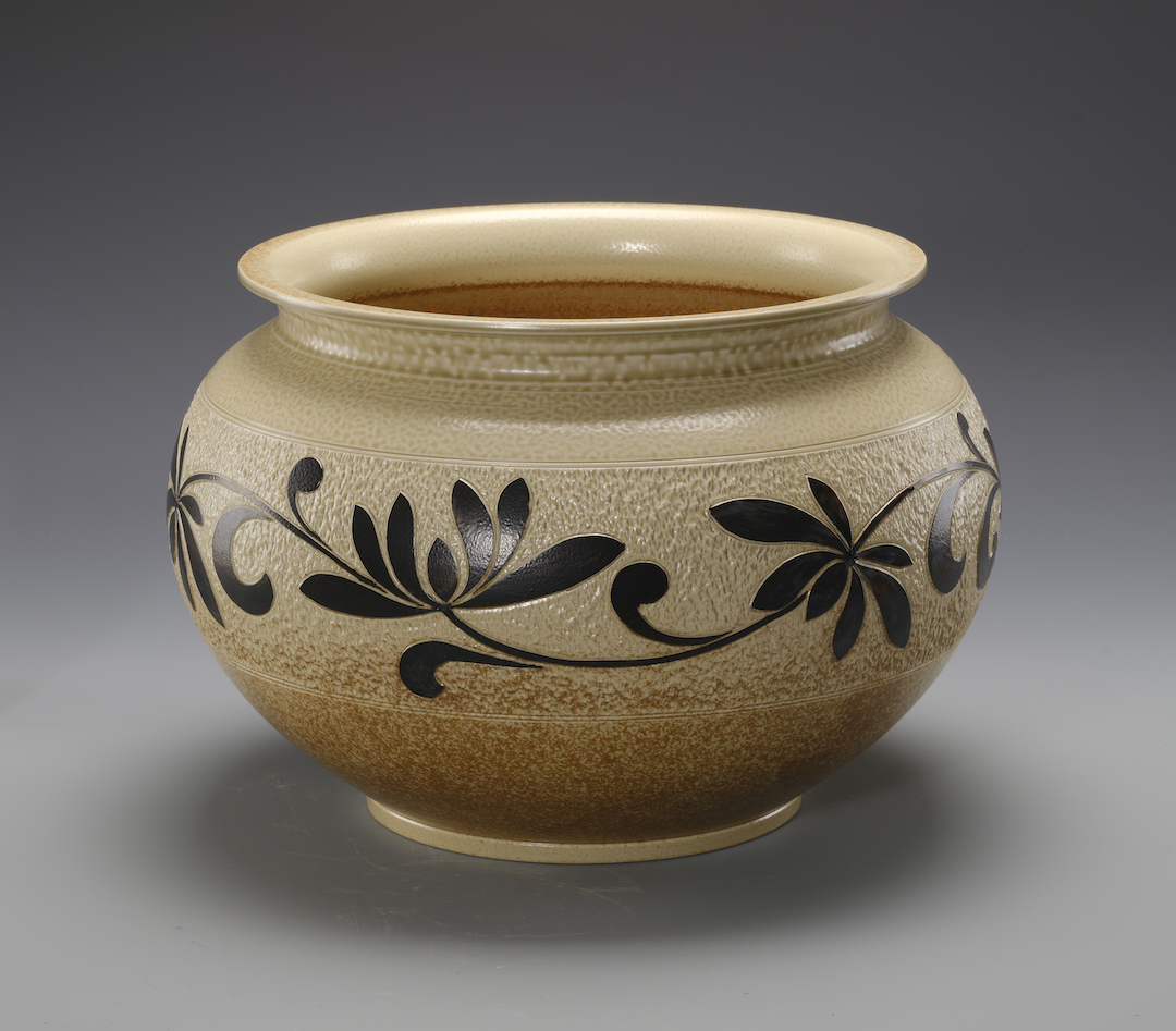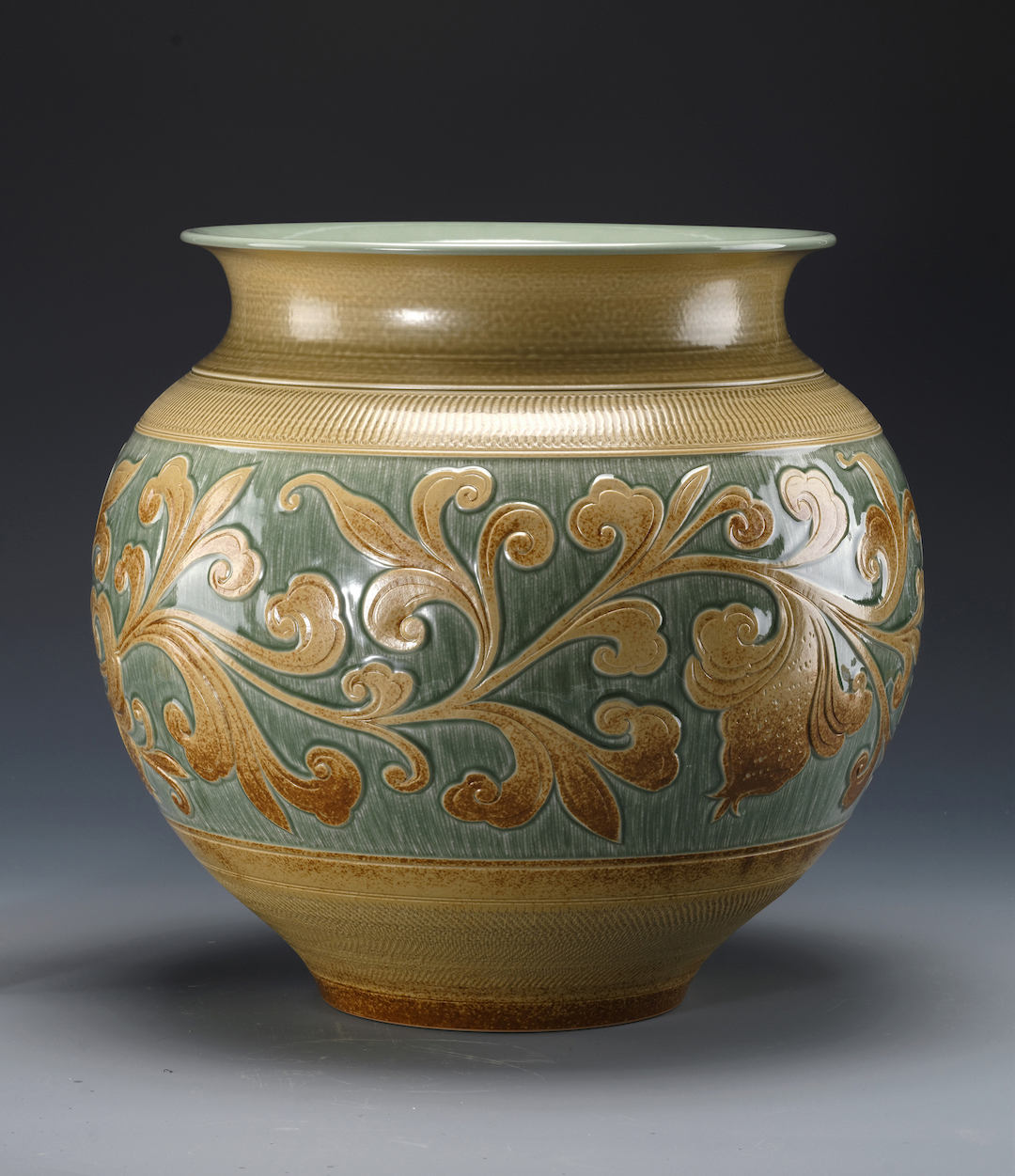 作品造型浑厚古朴,施草木灰釉,腹部刻缠枝花卉并露胎,纹饰底部用青釉装饰,纹饰饱满而有立体感。