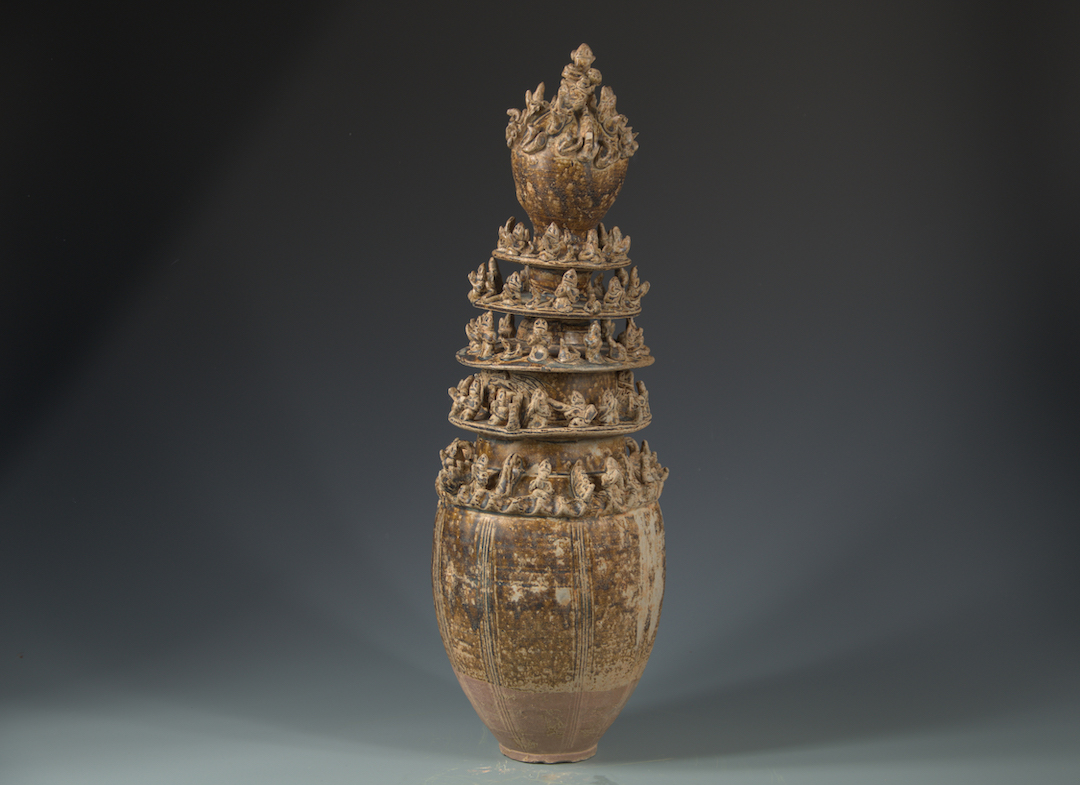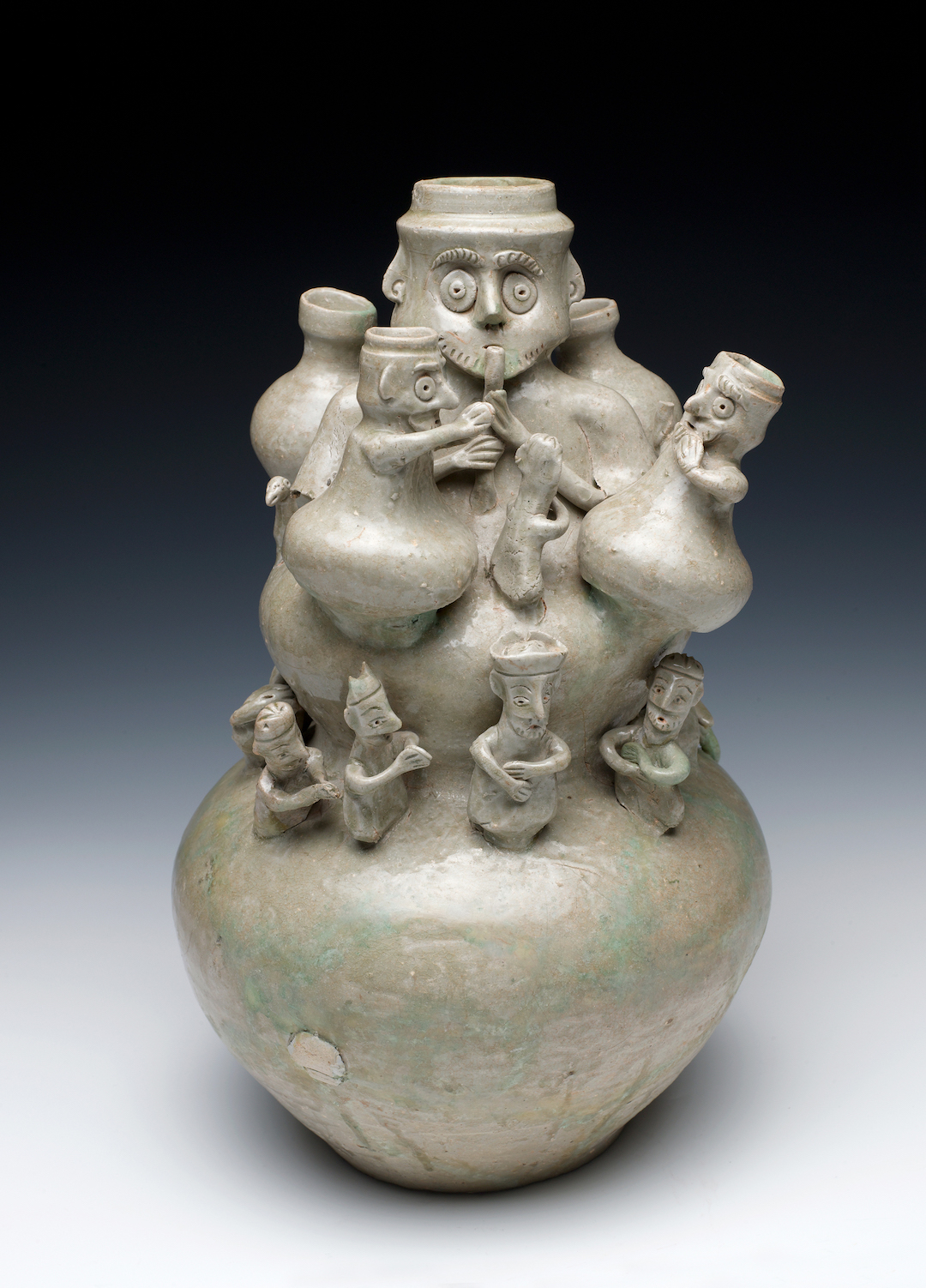 这件五管瓶造型尤为生动活泼,其上装饰的胡人载歌载舞,有的吹奏乐器,有的打着拍子,好不欢乐,胡人形象则与当时东西方通过丝绸之路往来交流有关。