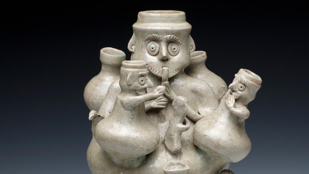 三国婺州窑伎乐俑青瓷五管瓶(局部)