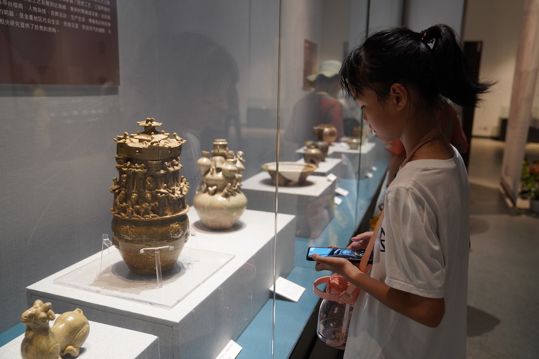 展览策展人、浙江省博物馆工艺部主任范佩玲介绍,婺州窑除了印象中明器一类的堆塑瓶以外,还有许多运用了典型工艺巧思而制作的生活用品。比如宋代的婺州窑青瓷瓜棱执壶,用堆塑工艺在瓶口与瓶身的连接处做了个蝴蝶结,十分可爱;青瓷褐彩壶则是以褐彩的工艺描画了绸缎一般的纹样,显得十分飘逸雅致。
