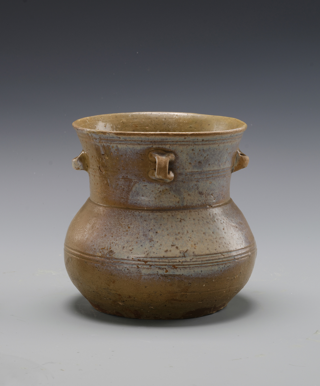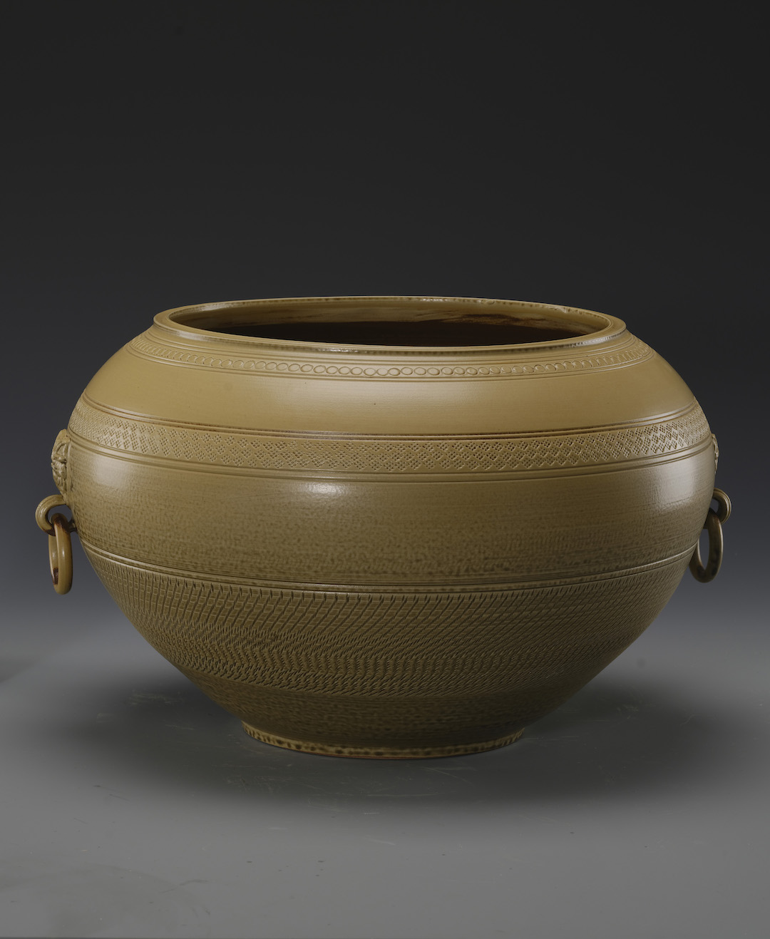 作者追溯本地原始瓷的釉色,调配出了温润古朴的草木灰釉,奠定了当代婺州窑的釉色基调。作品肩部印连珠纹,腹中部对称贴辅首活环,腹下部饰跳刀纹,整器施草木灰釉,器型饱满端庄。