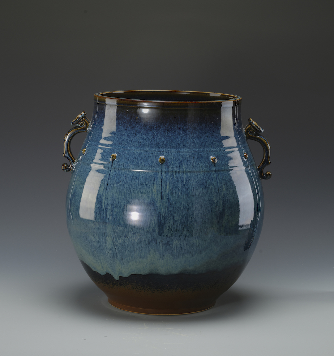 古代婺州窑乳浊釉瓷以南宋铁店窑产品为最精。当代婺州窑匠人重现了铁店窑乳浊釉色,并赋予其当代审美。作品雍容大气,口沿至颈部的釉色渐变自然,肩部、上腹部为深浅交融的天蓝色乳浊釉,颈部饰鼓钉纹一周,两侧饰如意造型双耳,象征事事顺心如意。