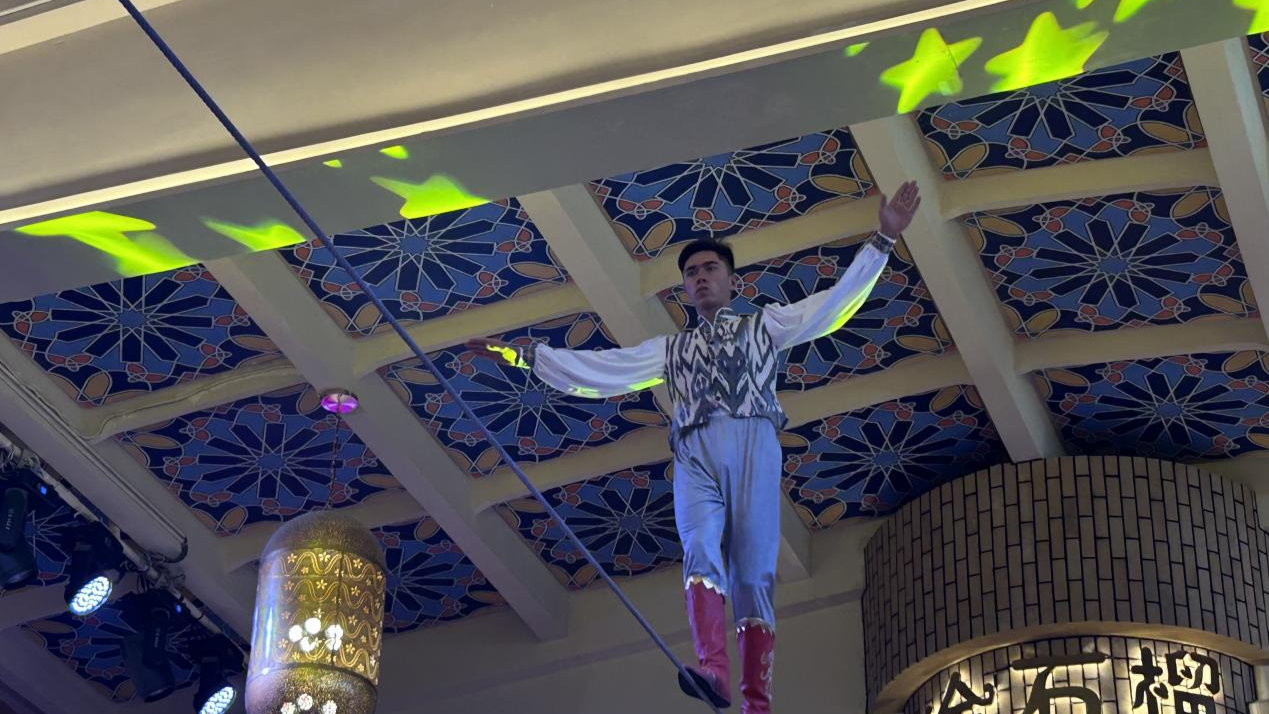 馕坑肉、大盘鸡、烤全羊、烤肉、椒麻鸡……20多个档口上百种南北疆特色美食,以少数名族民俗为背景的主题包厢,试营业当天就吸引了众多市民前来打卡。现场只见达瓦孜传承人双手紧握平衡杆,稳稳站在绳索上,除了表演俯仰身躯,前进后退外,还随着音乐的节拍表演高难度动作,引来观众阵阵喝彩。