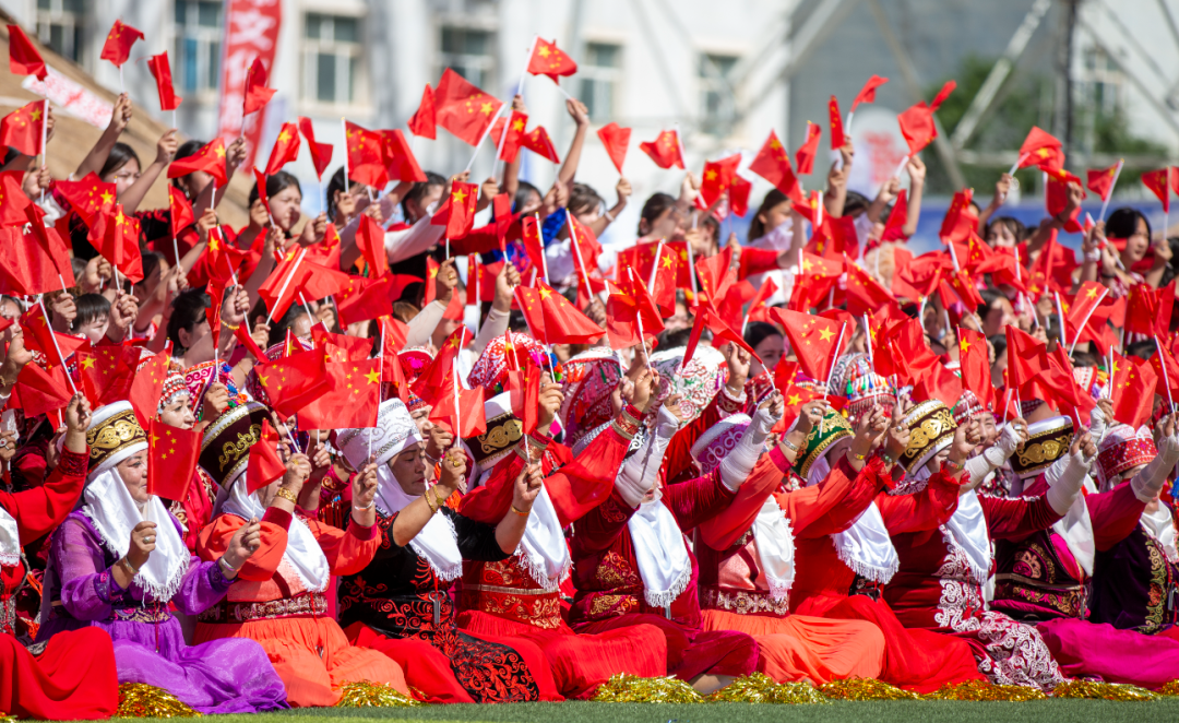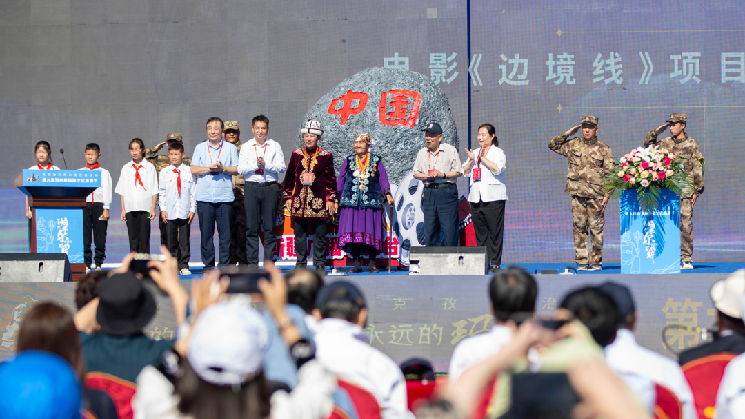 开幕式上,“布大妈”和“最美奋斗者”吴登云、“党徽大叔”阿不都加帕尔·猛德一亮相,台下各族人民爆发出如潮般的欢呼和掌声。几位英雄共同为电影《边境线》落地乌恰县揭幕——红幕揭开,镌刻着“中国”的巨石屹立在舞台之上。