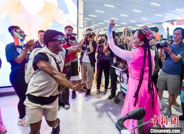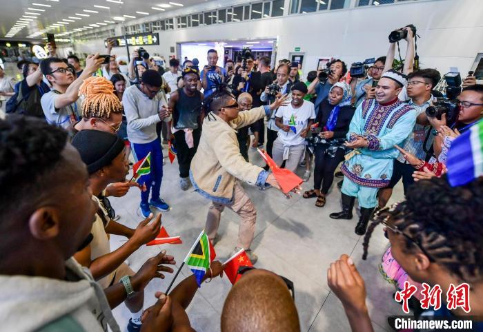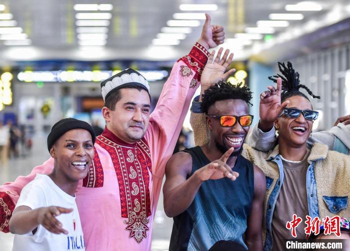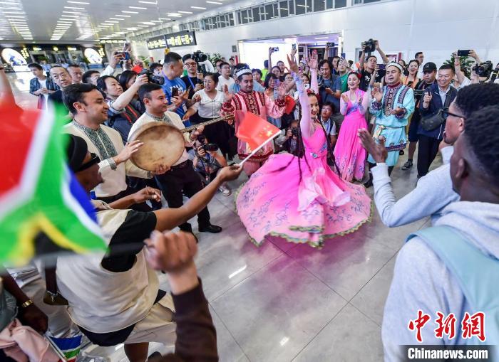 7月23日晚,新疆乌鲁木齐地窝堡国际机场,南非埃尔维斯舞蹈艺术团舞蹈演员跟着新疆艺术剧院木卡姆艺术团演员舞步,学跳新疆舞蹈。当晚,前来参加第六届中国新疆国际民族舞蹈节的南非埃尔维斯舞蹈艺术团乘机抵达乌鲁木齐,主办方以“快闪的”方式,用新疆民乐和舞蹈迎接远道而来的客人。据了解,南非埃尔维斯舞蹈艺术团将携舞剧《乌班图之魂》,亮相本届中国新疆国际民族舞蹈节。7月24至25日,该团将在新疆人民剧场奉献两场展现南部非洲大地人文风光的精彩演出。记者刘新摄