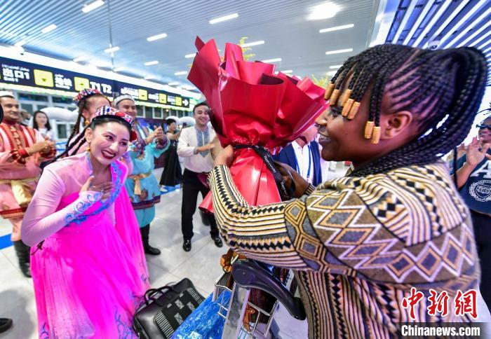 新疆艺术剧院木卡姆艺术团演员为刚刚抵达的南非埃尔维斯舞蹈艺术团送上鲜花以示欢迎。刘新摄