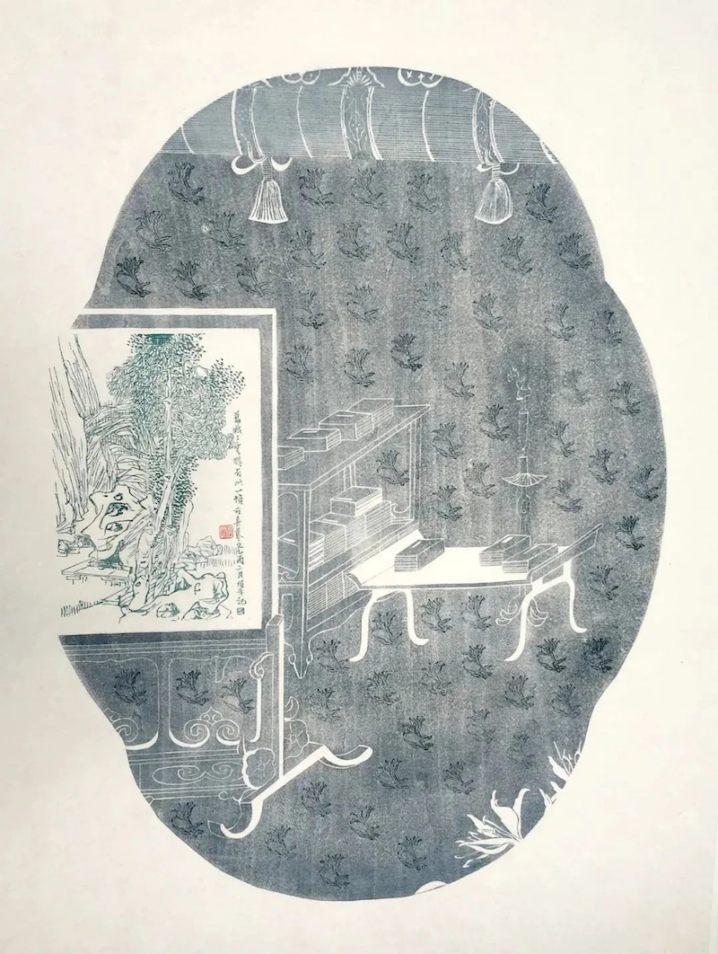另一位艺术家杜洋则结合苏州古典园林元素和苏州桃花坞木版年画吉祥寓意,创作了《小园即事》系列水印版画。在其对立夏的描绘中,画面主要表现苏州园林一角,呈现传统莲瓣式之窗,窗内一棵芭蕉树,芭蕉枝繁叶茂,有团结和富贵的寓意。而在其中国屏风系列中,作品《曲桥通幽》画面表现了室内书房的景色,和屏风形成呼应,体现一种安静的读书意境。
