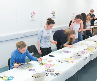 照片里,英国学员或认真观摩绘画,或亲手体验创作。其中一张照片是一群英国大学生正接力在一幅百米长卷上作画,他们的笔下,一朵朵鲜艳的牡丹接连绽放。
